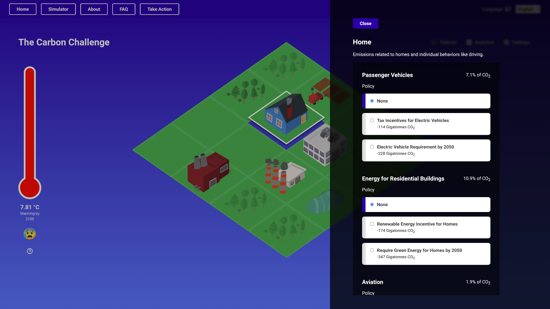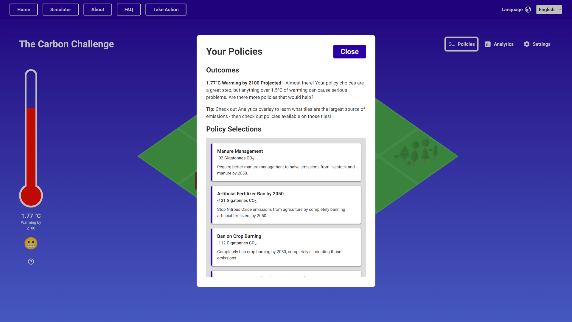 To create this project I spent dozens of hours researching and months of development to create a robust yet simple simulation of our climate that I could then manipulate with specific policies. I then created a clean interface inspired by games like Sim City to make it really easy for users to pick policies and see what impact they had.